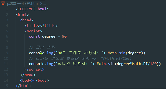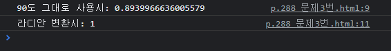 | 3. 모질라 문서에서 Math 객체와 관련된 내요을 읽고 사인 90도의 값을 구해보세요. 참고로 사인 90도는 1 입니다. 아주 단순하게 생각해서 구현하면 0.8939966636005579라는 결과가 나옵니다. 0.8939966636005579가 나왔다면 왜 그런지, 그리고 이를 어떻게 해야 제대로 사용할 수 있는지 구글 검색 등을 활용해서 알아보고 코드를 수정하세요. |